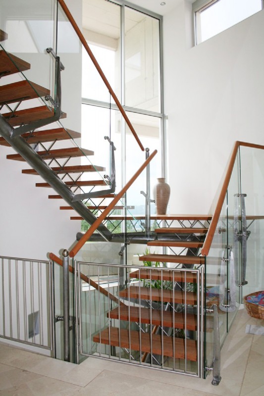 Aber auch wangenlose Stiegen sind möglich. Bei dieser Variante werden die Trittstufen durch seitliche Sprossen gehalten, die gleichzeitig auch das Geländer sind. Dies ergibt wiederum ein völlig anderes optisches Bild.